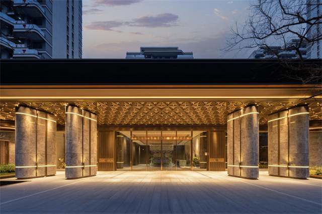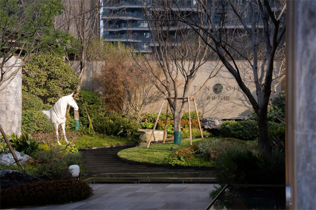从现场呈现来看,归家动线的设计颇具巧思。主入口以含蓄的艺奢门庭界定私属领域,通过侧向而入的三进院落,将归家路径自然隐匿于转折与序列之中。静谧水景、姿态黑松与艺术雕塑相互映衬,细节之处彰显匠心。这种对归家礼序与情绪转换的重视,是保利“天字系”产品的共同基因。